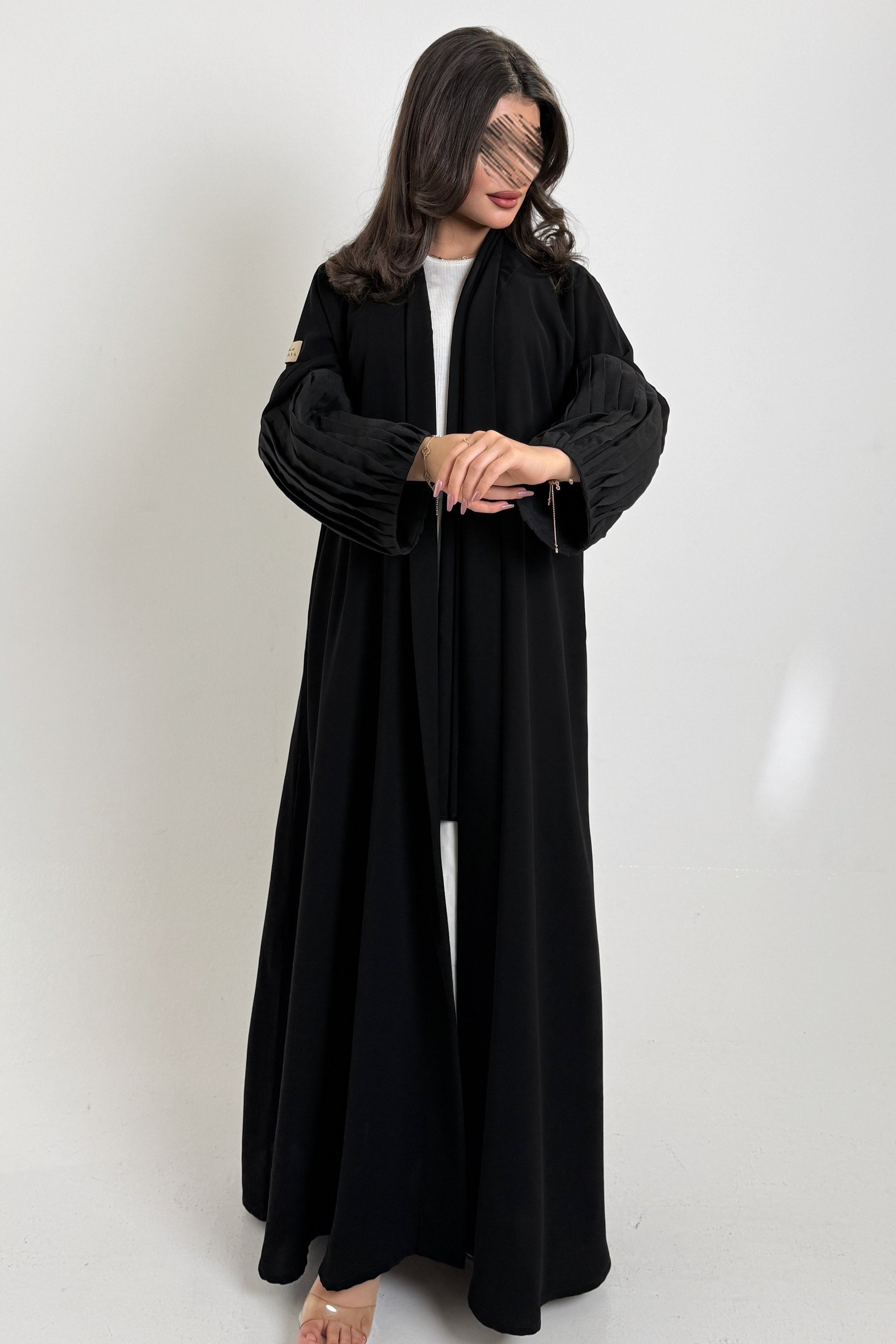 العباية تتألق بأسلوب راقٍ وفخم، حيث تتجلى الحرفية العالية في تفاصيل الكمّين، المزينة بتطريز متقن أو جديلة كثيفة مصممة يدويا تمنح ملمسًا ثلاثي الأبعاد غنيًا يبرز مهارة الصانع. الأسود الكلاسيكي يضيف عمقًا ورقيًا خالدًا، بينما يبرز التصميم الفني للكمّين لمسة فاخرة مع كل حركة. تنساب القصة بانسيابية رائعة تمنح حرية الحركة مع الحفاظ على الطابع الرسمي والأنيق، لتكون الاختيار الأمثل للإطلالات الرسمية، السهرات الخاصة، والمناسبات التي تتطلب أسلوبًا مميزًا يجمع بين الفخامة والأصالة.